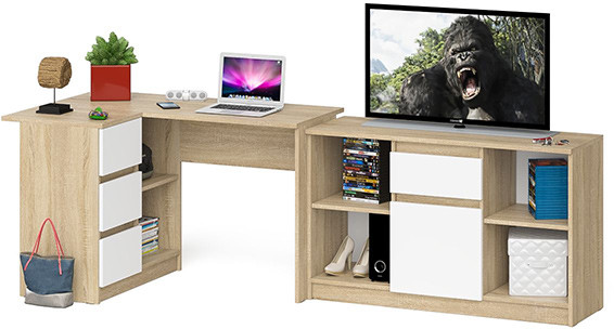 Тумба Мори МТВ1204.1 и стол компьютерный угловой МС-16 левый. Цвет - дуб сонома/белый. Габариты (ШхГхВ) 244,8х84,9х76,6 см. Выдвижные ящики слева. Не универсальная сборка. Отсутствие ручек главное преимущество данной модели. Роль ручек выполняют сами фасады. Угловой компьютерный стол МС-16 левый. Тумба имеет 3 выдвижных ящика и нишу с полкой по середине.Тумба ТВ МТВ1204.1 состоит из двух открытых ниш по бокам и ящика и закрытой нишей по центру.